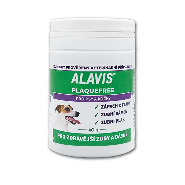 ALAVIS™ PlaqueFree je 100% přírodní produkt určený pro psy a kočky, který potlačuje zápach z tlamy, redukuje zubní kámen a odstraňuje zubní plak. Zlepšení nastává v rozmezí 3 - 8 týdnů. Přípravek je ve formě prášku a proto se lehce přidává do běžné potravy. Alavis™ PlaqueFree na rozdíl od ostatních metod odstraňování zubního plaku působí přípravek systematicky. Přes zažívací trakt se dostává do krevního řečiště a z něj pak do slin, kde rovnoměrně působí na dásně a na všechny zuby. Ovlivňuje schopnost zachycování bakterií, které se podílí na vzniku zubního plaku a změkčuje již vytvořený zubní kámen. Klinické studie provedené na lidech prokázaly, že akumulace látek na zubní sklovině je redukována až o 88 % a zubní kámen buď úplně zmizel, nebo se stal velmi porézním a tak snadno odstranitelným.