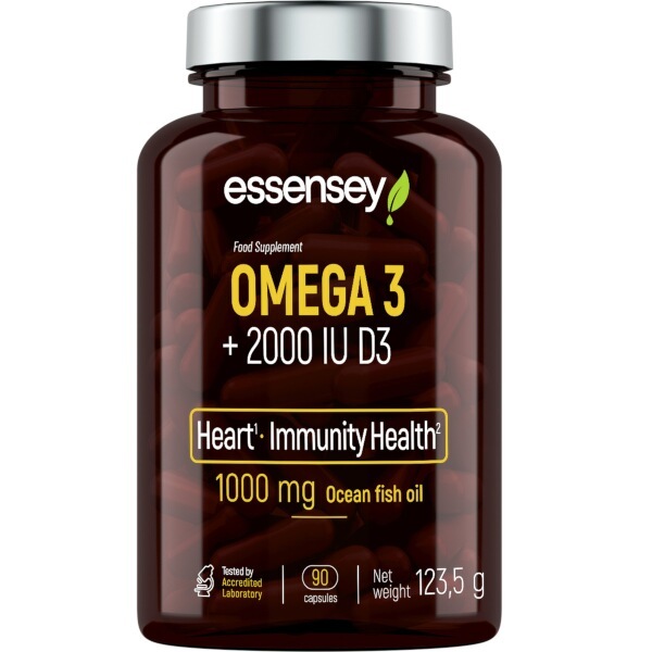 ESSENSEY OMEGA 3 + D3. Doplněk stravy. Přípravek v kapslích s obsahem rybího oleje, který dodává tělu esenciální mastné kyseliny EPA a DHA a vitamin D. Kyselina eikosapentaenová (EPA) a kyselina dokosahexaenová (DHA) přispívají ke správné funkci srdce. K příznivým účinkům dochází v případě konzumace 250 mg EPA a DHA denně. Vitamin D přispívá k normální funkci imunitního systému. Vitamin D přispívá k udržení normálního stavu kostí.