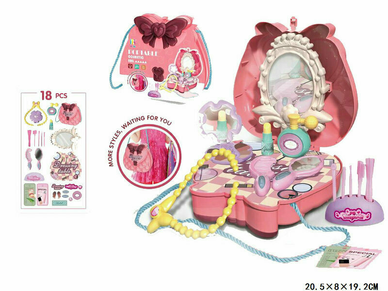 Toaletka jako przenośna kosmetyczka składająca się z 18 elementów. Dzięki temu, że toaletka pełni funkcję torebki, dziecko może ją zabrać wszędzie ze sobą. Idealny zestaw piękności dla każdej dziewczynki, z którym stworzy swój nowy look. Zawartość:- naszyjnik,- paletka do makijażu,- pędzle i aplikatory,- stojak na pędzle,- grzebień,- lusterko do ręki,- perfum,- pomadka,- lustro,- toaletka (torebka),- naklejki.Wszystkie przedmioty są imitacją prawdziwych. Wykonane z tworzywa sztucznego.Wymiary opakowania: 20,5x8x19cmWiek: 3+