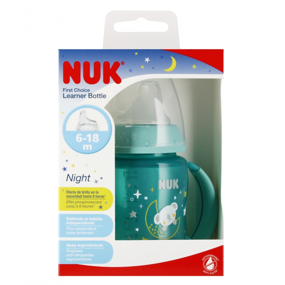 Butelka NUK First Choice do nauki picia posiada przyjemnie miękki, silikonowy ustnik, który umożliwia picie bez rozlewania. Zintegrowany system odpowietrzania NUK AIR SYSTEM wyrównuje ciśnienie w butelce, co pomaga zapobiegać kolce spowodowanej połykaniem powietrza przez dziecko. Butelka NUK First Choice do nauki picia z czujnikiem temperatury ułatwia naukę samodzielnego picia. Butelka posiada wskaźnik temperatury. Skala na butelce z czujnikiem temperatury zmienia kolor w zależności od temperatury zawartości. Jeżeli pokarm jest za gorący, zwykle niebieski wskaźnik zmienia kolor na biały. Uwaga: Wskaźnik temperatury NUK jest przewidziany jako dodatkowa weryfikacja. Prosimy o sprawdzenie temperatury bezpośrednio przed podaniem dziecku pokarmu. Przezroczysty silikon jest łatwy do czyszczenia i szczególnie odporny na zmiany temperatury. Ergonomiczne uchwyty są dopasowane do rączek dziecka i mają antypoślizgowe wypustki. Butelka z szerokim otworem o pojemności 150 ml składa się z typowych elementów First Choice: nakrętki, krążka zabezpieczającego oraz przezroczystej osłony ustnika - wszystkie elementy łatwo się demontuje, dzięki czemu butelkę łatwo się czyści i wygodnie przygotowuje się w niej pokarm. Butelka posiada elementy świecące w ciemności. Butelkę NUK First Choice do nauki picia można łączyć z innymi elementami serii NUK First Choice. Butelka występuje w turkusowym kolorze. Wymiary/waga: wymiary produktu wys. x szer. cm : 14x12, wymiary opakowania wys. x szer. x gł. cm : 15x11x8, waga produktu bez opakowania kg : 0,09 kg, waga produktu w opakowaniu kg : 0,12 kg. Produkt przeznaczony dla dzieci w wieku: 6-18m . Pakowany w kartonik z okienkiem. Wyprodukowano w Niemczech