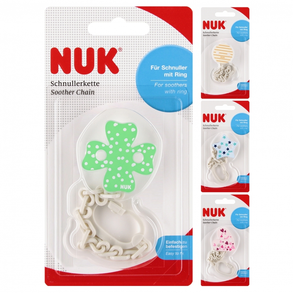 Łańcuszek NUK służy do przypinania smoczka do ubrania dziecka. Chroni smoczek przed zgubieniem i zabrudzeniem. Pasuje zarówno do smoczków z uchwytem, jak i bez uchwytu, praktyczny klips, który można przypiąć jedną ręką. Klips posiada otwory umożliwiające oddychanie w razie włożenia go przez dziecko do buzi. Klips jest gładki i ma opływowy kształt, nowoczesne wzory i kolory z limitowanej serii NUK. Łańcuszek w czterech różnych kształtach: niebieska gwiazdka, różowe serce, beżowe koło, zielona koniczyna. Opakowanie zawiera 1 szt. tasiemki do smoczka. Wymiary/waga: wymiary opakowania dł. x wys. x gł. cm : 10x18x2, waga produktu w opakowaniu kg : 0,02 kg. Produkt przeznaczony dla dzieci w wieku: 0m . Pakowany w pudełeczko z zawieszką. Wyprodukowano w Niemczech.