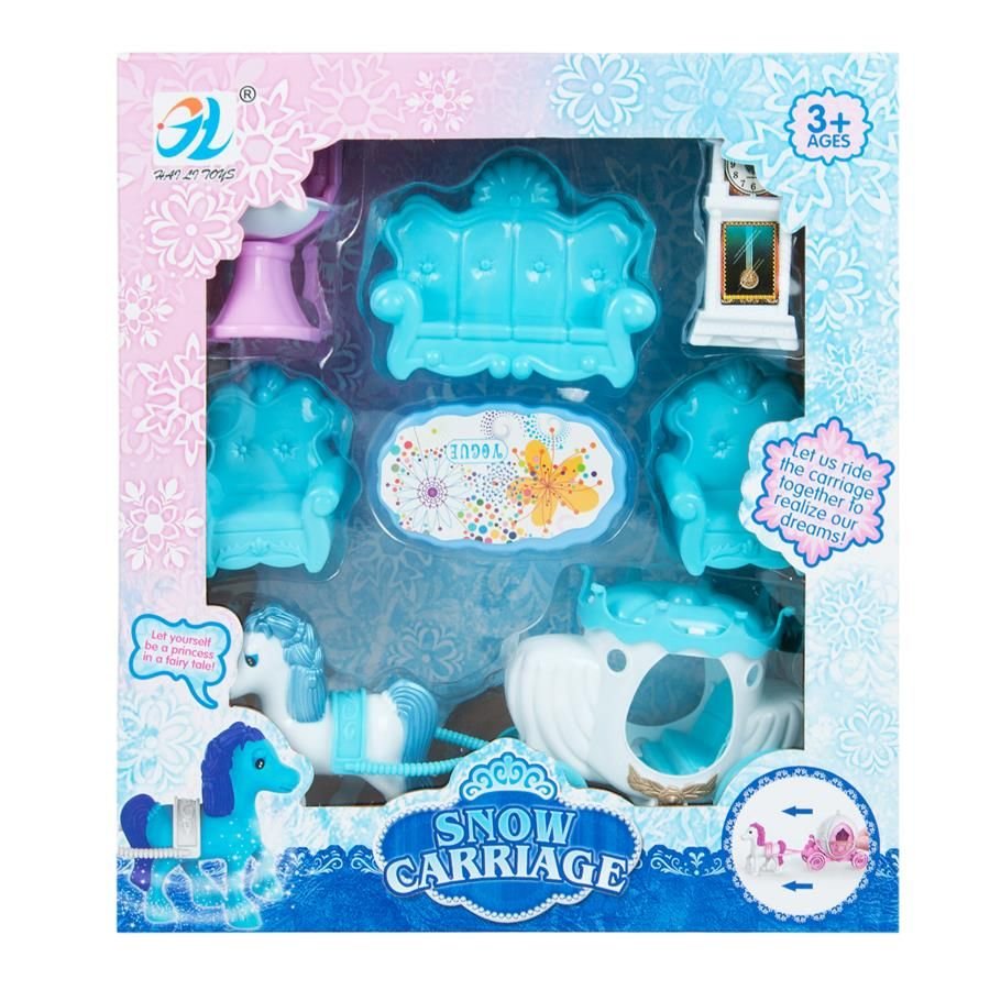 Set nábytku ideální do domečku pro panenky: kočár s koněm, toaletní stolek, stolek, pohovka, 2x křeslo, stojící hodiny. Nezbytná sada nábytku do domečku pro panenky. Kromě skvělé zábavy pomohou rozvíjet dětskou mysl! Obsah setu: 2x křeslo, pohovka, koňský spřežení, toaletní stolek, stolek, stojící hodiny.