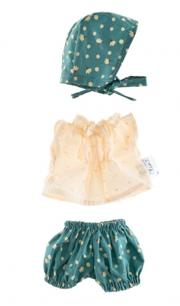 Okouzlující set v smetanové a zelené barvě. Top je vyroben ze vzdušné a jemné bavlněné látky plumeti v teplém béžovém odstínu. Vpředu je mírné nařasení pro snadnější oblékání panenky. Dokonale ladící nařasené květy v odstínu mořské zelené s potištěnými béžovými puntíky a jemnými květy. Zelený klobouk s kravatou dodává celému setu kouzlo. Látka, ze které jsou kraťasy a čepice vyrobeny, může být díky potisku trochu tuhá, ale po prvním vyprání změkne.