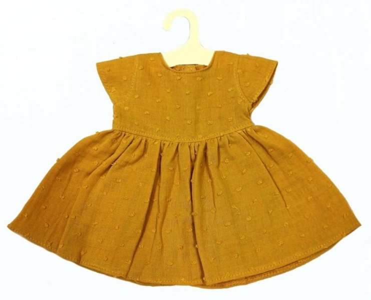 Dlouhé šatičky po kolena panenky z jemného bavlněného mušelínu medové barvy.