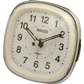 BudíkNapájení z bateriePouzdro ve tvaru čtvercePlastové pouzdroBílá barva pouzdraRučičkový ciferníkBílá barva ciferníkuCiferník s arabskými číslyOsvětlení displejeBudík