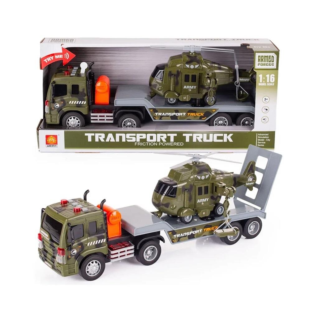 Przygotuj się na pełną emocji akcję w zaciszu swojego salonu! Nasz zestaw Samochód ciężarowy z naczepą, na której umieszczony jest helikopter wojskowy to zabawka, która wprowadzi Twoje dziecko w świat wojskowych przygód i militariów. Dzięki dokładnemu odwzorowaniu w skali 1:16, klasyczna zieleń i czarne elementy z napisami wojskowymi sprawią, że maluch poczuje się jak prawdziwy żołnierz. Zestaw posiada liczne funkcje zarówno manualne jak i świetlne i dźwiękowe.