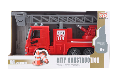 Plastové hasičské auto na baterie a stříkaci vodu. Pomocí dvou tlačítek umístěných na kabině vydává zvuky jízdy a couvání. Baterie 3xAG13 jsou součástí balení. Lze naplnit nádržku vodou a pomočí manuálního tlačítka stříkat vodu z hadičky. Baleno v krabici. Rozměry balení cca 32x11,5x18x5 cm. Rozměry auta cca 25x16x9 cm. Věk 3+