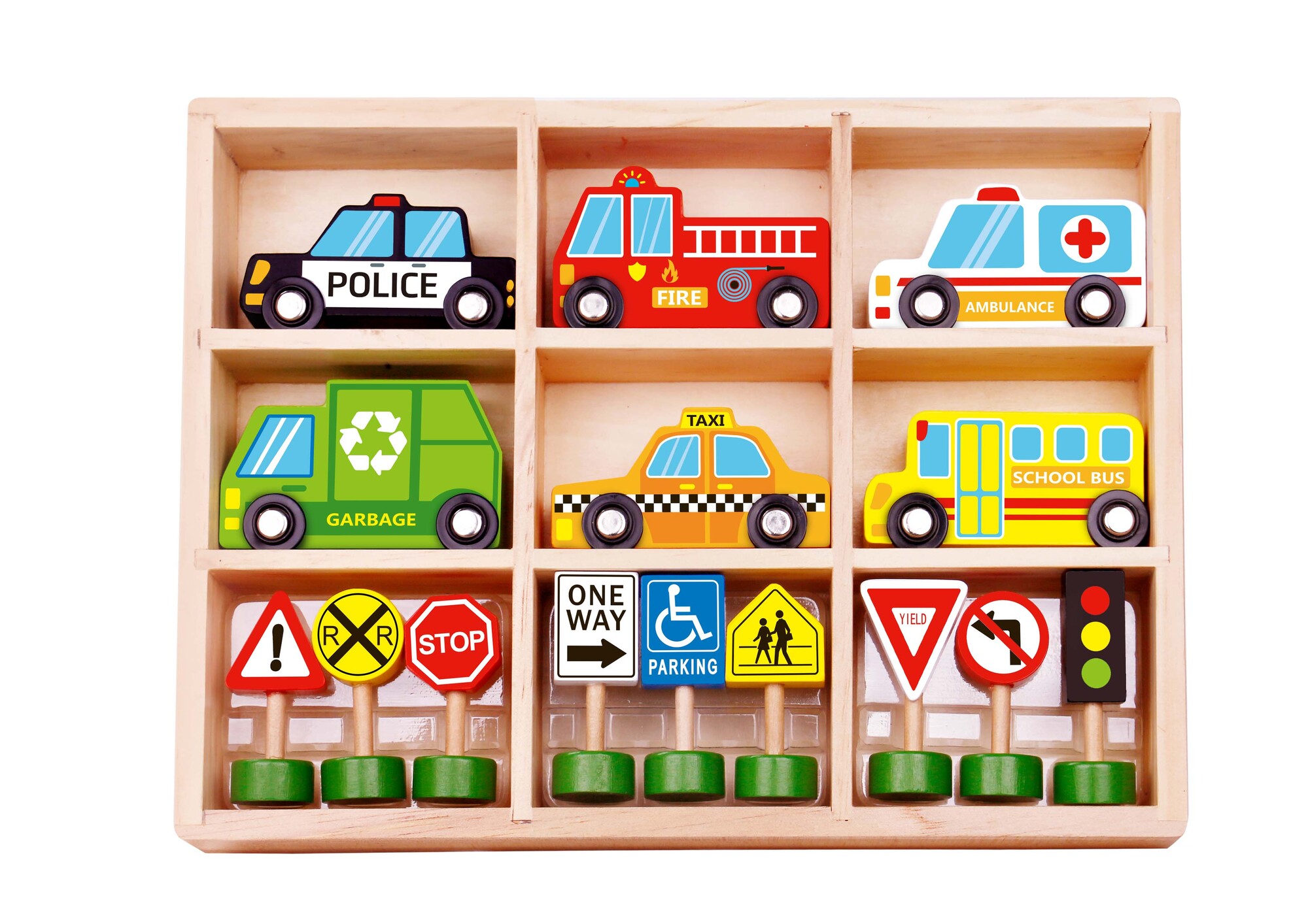 Táto sada drevených vozidiel a dopravných značiek bude deti baviť a zamestná ich na celé hodiny. Set obsahuje 6 vozidiel (policajné autíčko, sanitku, hasičské auto, smetiarske auto, taxi a školský autobus) a 9 dopravných značiek.