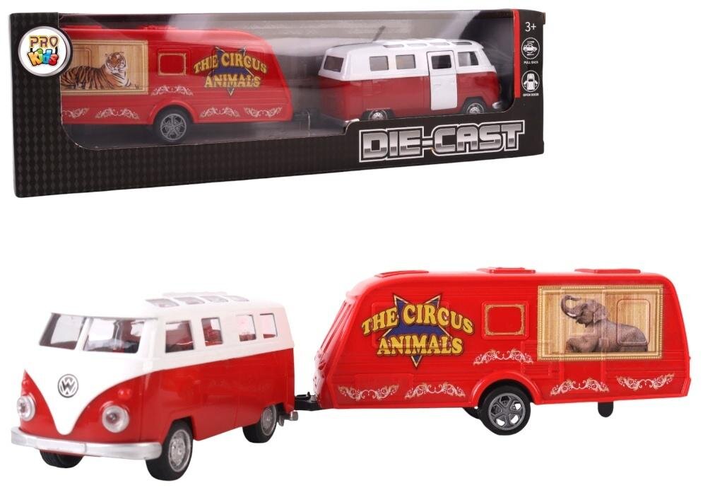 Ten urokliwy zestaw to hołd dla kultowego designu lat 60., łączący retro busa typu van z efektowną przyczepą cyrkową, ozdobioną grafiką przedstawiającą egzotyczne zwierzęta w stylu vintage. Całość tworzy wyjątkową scenografię do zabawy, kolekcjonowania lub opowiadania własnych przygód pod namiotem wielkiego cyrku.
