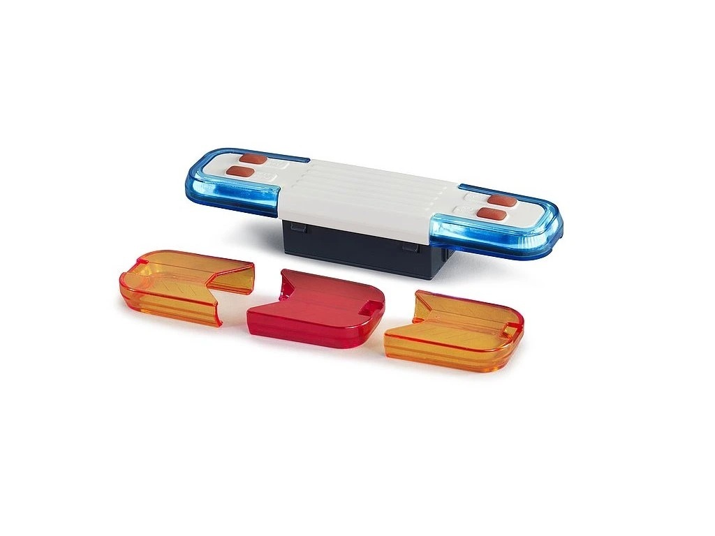 Moderní světelný a zvukový modul vyniká špičkovým designem a rozšiřuje funkce všech nákladních vozů BRUDER. Čtyři různá funkční tlačítka umožňují přehrávání zvuků motoru, policejní sirény, hasičské sirény a výstražného signálu po dobu přibližně 20 sekund. Krátký výstražný signál je obzvlášť vhodný pro použití v hustém provozu a na křižovatkách, kde přitahuje větší pozornost při zapnutém výstražném světle a zvuku záchranných vozidel. Světelná funkce se spouští současně s odpovídajícím zvukem. Modul umožňuje nasazení dvou modrých krytů (např. pro policii), dvou oranžových krytů (např. pro servisní vozidla) a jednoho červeného krytu (např. pro záchranné služby v USA) v libovolné kombinaci. Díky standardizovanému BRUDER konektoru je tento modul velmi univerzální. Součástí balení je také adaptér, který umožňuje použití modulu i na nákladních vozech s otvorem ve střeše. Hlavní vlastnosti: automatické vypnutí po cca 30 sekundáchrychlé vypnutí opětovných stiskem tlačítka4 zvuky - motor, policejní siréna, výstražný policejní signál, hasičská sirénasvětelná funkcenapájení 2x AAA baterie (jsou součástí balení)vyrobeno v Německu