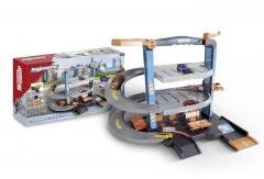 Garaż 3-poziomowy, dystrybutor z pompką, ręczna winda dla samochodów, lądowisko dla helikoptera, elementy do wycięcia z kartonu, przenośna myjnia samochodowa. W zestawie 5 metalowych pojazdów w skali 1:64, 3l+