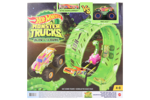 Herní set Hot Wheels® Monster Trucks Svítící ve tmě Výzva epické smyčky™ je epická závodní zábava, která bude ještě více vzrušující, když zhasnou světla! Modré, zelené a žluté části setu ve tmě svítí a osvětlují akci na trati. Odpal svá auta do akce bok po boku a sleduj, jak proletí smyčkou a přistanou v trofeji! Součástí balení je jeden monster truck Hot Wheels® a jeden angličák v měřítku 1:64, které samozřejmě ve tmě také září, takže akrobatické kousky můžeš začít zkoušet hned po vybalení! Skvělý tip na dárek pro děti od 4 až do 8 let. Nelze kombinovat s některými sety Hot Wheels®. Barvy a vzhled výrobku se mohou lišit.