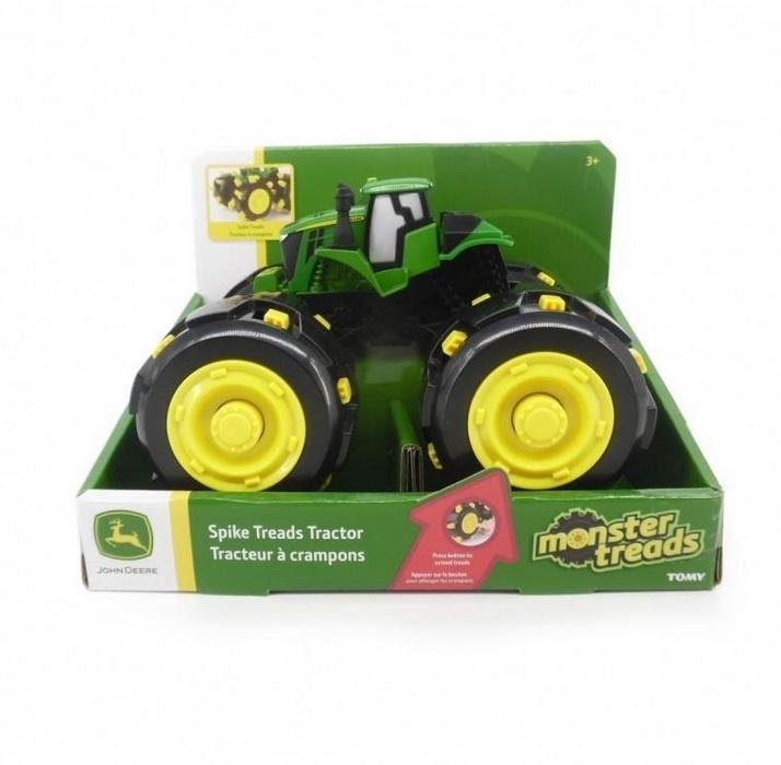 Plastikowy model traktora firmy John Deere na dużych kołach w wysuwanymi kolcami. číst celé