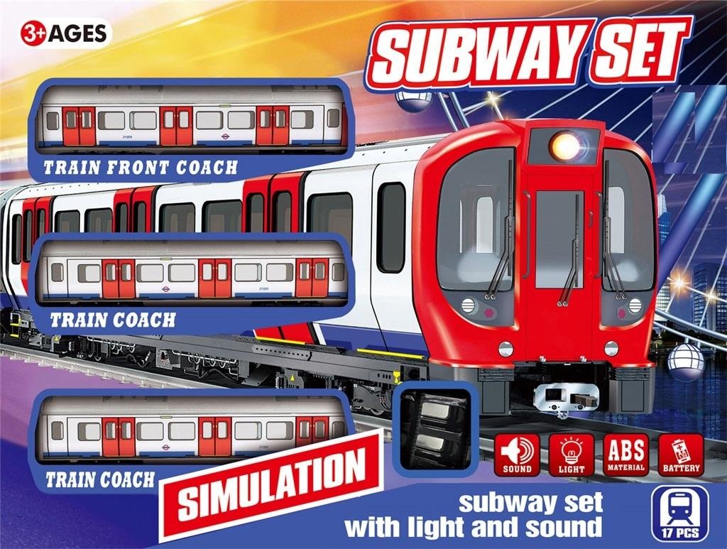 Kolejka ze światłem i dźwiękiem z torami. Zestaw składa się z trzech elementów pociągu (wagon z silnikiem i dwa wagony pasażerskie) oraz 14 elementów torów ( 2x proste, 12x łuki). Kolejka na baterie 3x AA, zestaw ich nie zawiera. Średnica toru - 70 cm. číst celé