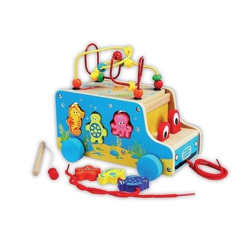Auto 5 w 1 to wielofunkcyjna zabawka do ciągnięcia. Zapewni dziecku wielogodzinną zabawę pełną atrakcji. Auto ma sznureczek do ciągnięcia i chętnie wyruszy z maluchem w podróż. Podczas spaceru zabawne oczy umieszczone na masce poruszają się. Na dachu pojazdu znajduje się labirynt do przeplatania kolorowych koralików, który można schować do środka. Boki auta to sorter, gdzie można dopasowywać klocki w kształcie zwierzątek morskich. Zwierzątka można także nawlekać na sznurek, a dzięki wbudowanym maleńkim magnesom zabawka jest także zręcznościową grą w łowienie rybek.