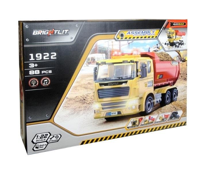 Ciężarówka budowlana do samodzielnego skręcenia. Ciężarówka wydaje dźwięki i świeci kolorowym światełkiem. Ciężarówka posiada ruchome części: otwieranie drzwi, unoszenie przyczepy w górę czy unoszenie kabiny ciężarówki. Zestaw składa się z 88 części. číst celé