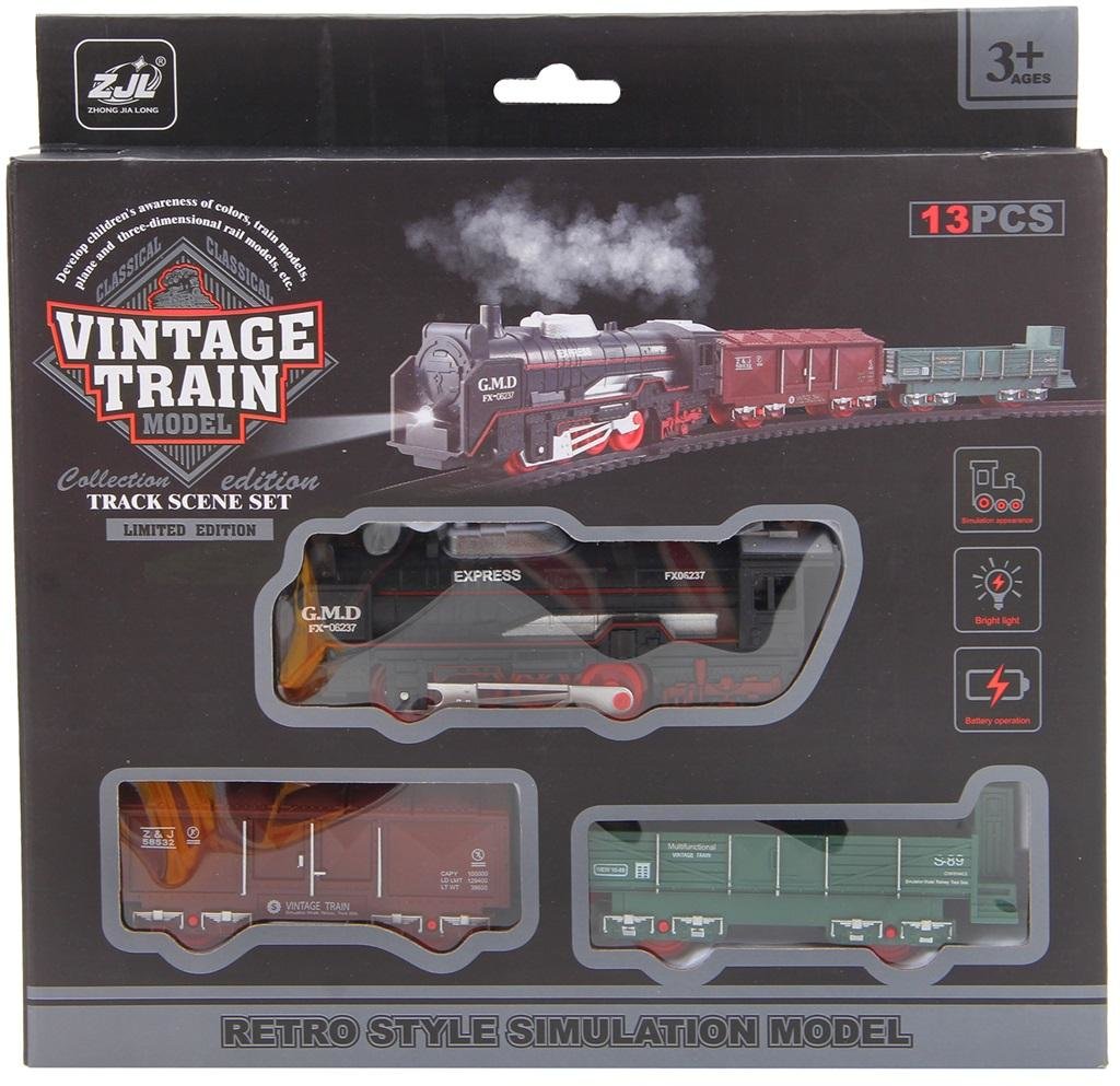 Kolejka na baterie - 13 elementów: lokomotywa, 2 wagony, tory. Tory po złożeniu stworzą koło, po których będzie poruszać się kolejka.