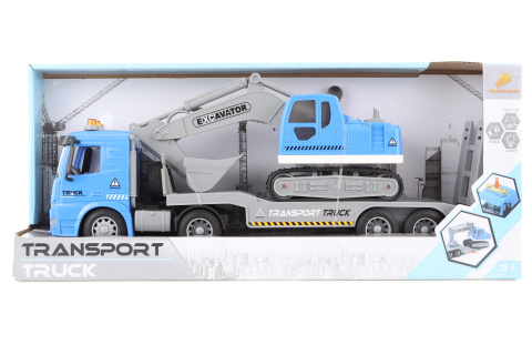 Plastový kamion s bagrem na baterie. Svítí a vydává zvuky. Rozměr kamionu cca 41 x 13, rozměr bagru cca 26 x 13 cm. Rozměr balení cca 48 x 20,5 cm. Věk 3+