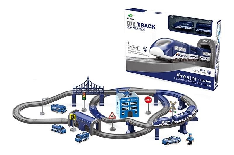 W zestawie: elementy do złożenia torów, wiaduktu, posterunku policji, tunelu, lokomotywa 11 cm, 2 wagony, figurka policjanta, 6 znaków drogowych, 4 auta, helikopter, naklejki, akcesoria.