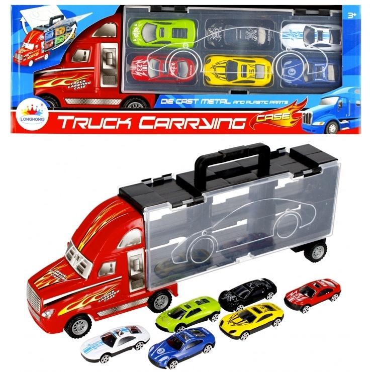 Kamion s autíčky . Ideální auto pro každého automobilového fanouška! Kamion dokáže přepravit až 6 aut. Obsah sady: kontejnerové auto, 6 x malé autíčko. Určeno pro děti a věk: 3+. Rozměry produktu [cm] 36 x 13 x 8.