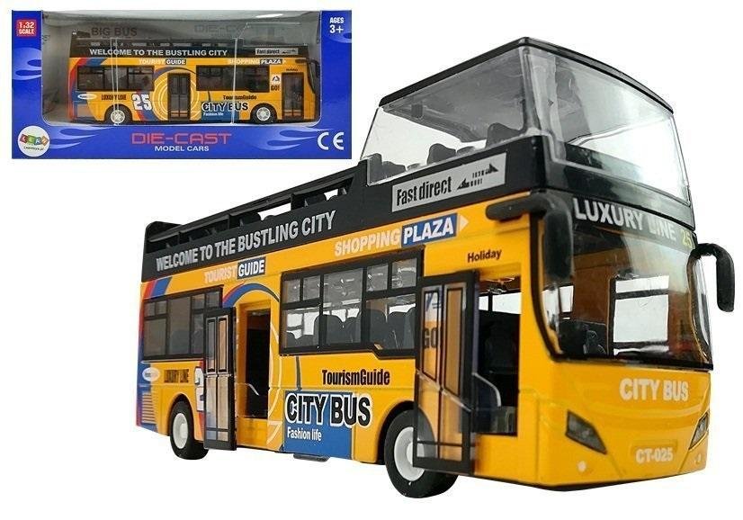 Autobus Piętrowy z Dźwiękiem 1:32 Otwierane Drzwi Żółty Małe samochodziki to najpopularniejsze zabawki, które są uwielbiane przez chłopców w każdym wieku. Służą one do przeróżnych zabaw oraz do kolekcjonowania. Posiadając zestaw różnych aut, chłopiec może bawić się w wyścigi, a także salon samochodowy, w mechanika czy kierowcę piętrowego autobusu. Realistyczny model wykonany został z dużą precyzją. Gwarantuje świetną zabawę, która rozwija wyobraźnię dziecka oraz w bezpieczny sposób pozwala zapoznać mu się ze światem realnym. Dużą zaletą autobusu jest pierwszorzędne wykonanie, na co składa się design uwzględniający najmniejsze szczegóły, a także solidny i trwały materiał, odporny na częstą zabawę. Kolory autobusów są bardzo intensywne, dzięki czemu przyciągają wzrok każdego chłopca. Konstrukcja inspirowana jest klasycznym modelem. Za przeszklonymi szybami znajdują się fotele i kierownica, dzięki czemu zabawa z pewnością będzie rewelacyjna. Dodatkową zaletą naszych autobusów piętrowych jest funkcja wprawienia w ruch. Wystarczy pociągną zabawkę po podłożu w tył i autobus zacznie jechać. Autobus posiada: - Napęd Pull Back - Po dociśnięciu go do podłoża uruchamiają się światła i dźwięki - Suwak przy podłodze, którym otwieramy drzwi - Bogatą kolorystykę - Metalową konstrukcję Wymiary autobusu: Długość: 17 cm Wysokość: 7 cm Szerokość: 5 cm Wymiary opakowania: 22 cm x 10 cm x 8 cm
