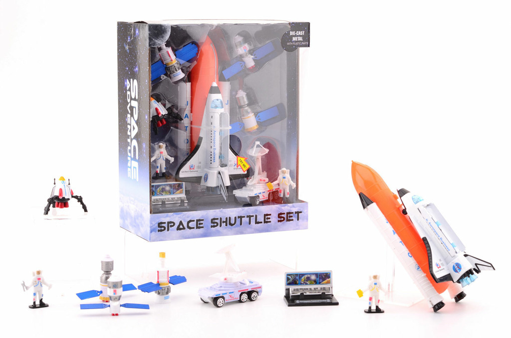 Raketoplán hrací sada obsahuje - kovový model raketoplánu, družice, lunární vozidlo, kosmonauty se světlem a zvukem.
