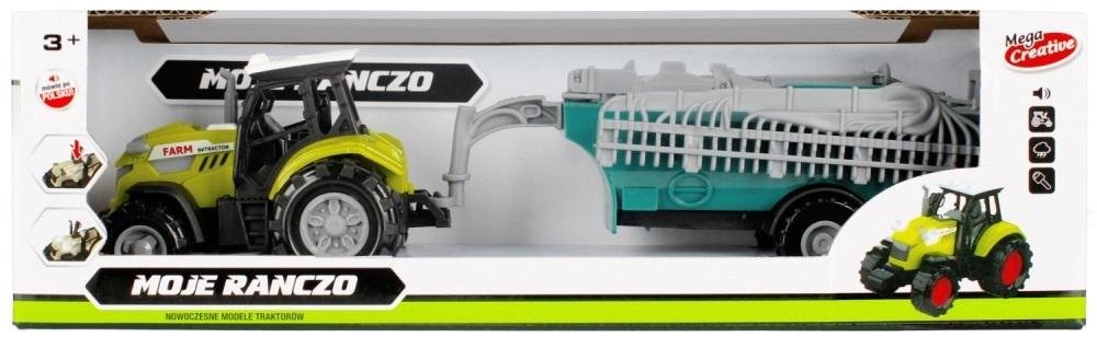 Zalety produktu: pojazd posiada efekty dźwiękowe: odgłos klaksonu, komendy wypowiadane przez kierowcę traktora "ruszamy do pracy wszyscy gotowi", "uwaga idzie burza", "koniec na dziś wracamy do domu", posiada odczepianą maszynę rolniczą z ruchomymi elementami, traktor posiada efekty świetlne. Maszyna Rolnicza z serii Moje Ranczo to nowoczesny model traktora, posiadający szereg możliwości i efektów pozwalających na różnorodną i rozwijającą zabawę. Zabawa Traktorem MEGA CREATIVE to gwarancja wspaniale spędzonego czasu! Zawartość zestawu: traktor z przyczepą. Zestaw wykonany z plastiku. Wymiary/waga/baterie: wymiary produktu (dł. x wys.x gł.) [cm]: traktor-11x7x7, przyczepa- 16x7x5, wymiary opakowania (dł. x wys. x gł.) [cm]: 29x9x8, waga produktu bez opakowania [kg]: 0,11 kg, waga produktu w opakowaniu [kg]: 0,18 kg, wymaga zasilania bateriami 3 x AG13- załączono do zestawu. Zabawka przeznaczona dla dzieci w wieku: 3+. Traktor pakowany w kartonik z otwartym okienkiem.