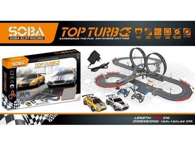 Tor wyścigowy z pętlą i skrzyżowaniami. Długość toru: 790 cm. Rozmiar toru po rozłożeniu: 155 x 130 x 36 cm. W zestawie ładowarka.