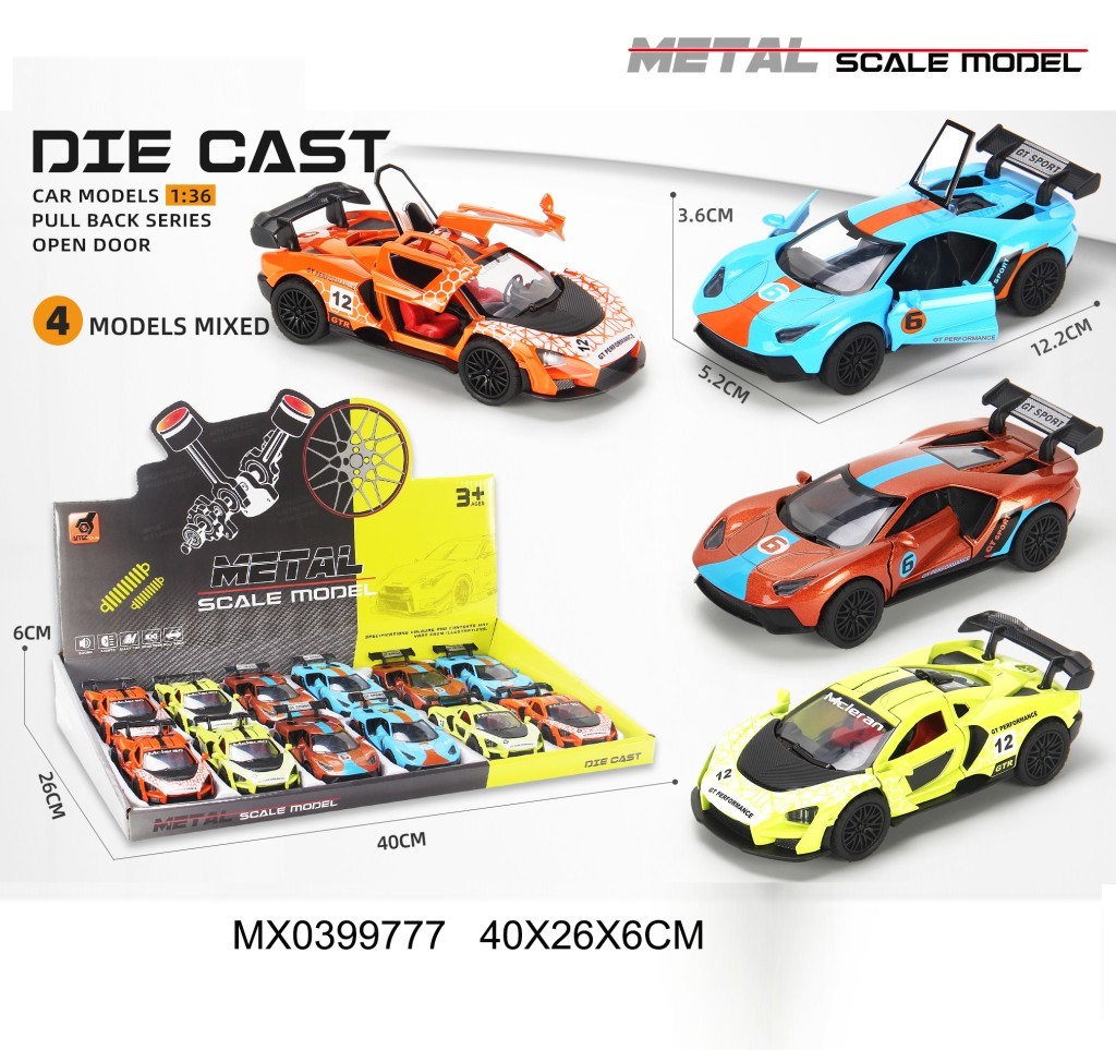 Kovový model auta ve 4 designech, kterému lze otevírat dveře. Funkce pull back - natáhni a jeď.