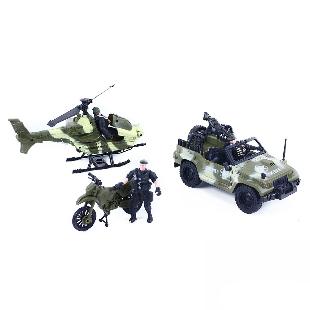 Parádní sada pro všechny malé vojáky! Tento ARMY set obsahuje helikoptéru, motorku, vojenský jeep a tři vojáky. Tato sada nesmí chybět ve tvé armádní jednotce! Auto jezdí na volný chod.