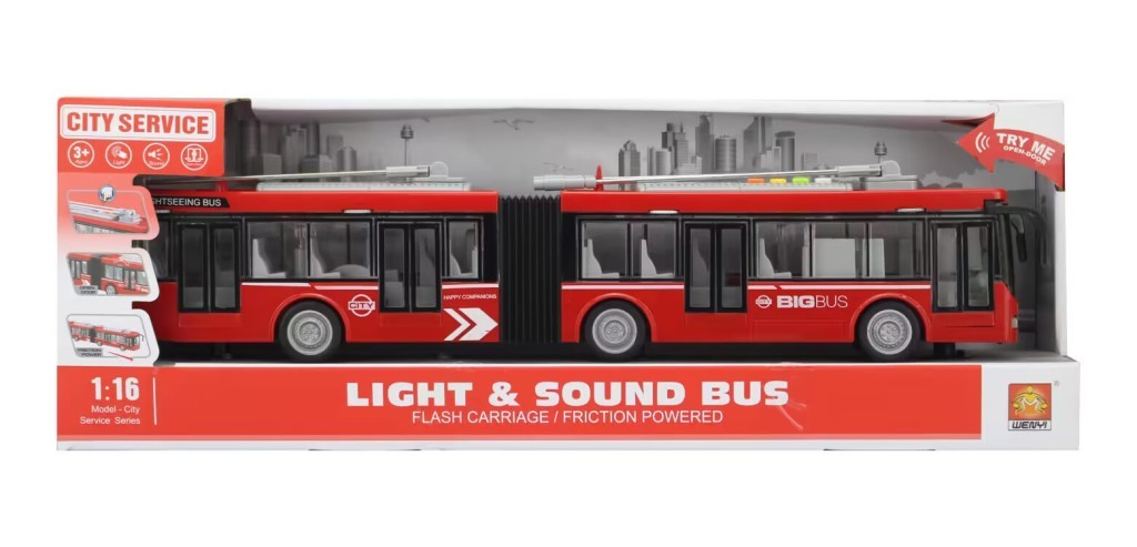Kloubový trolejbus na setrvačník. Realistické provedení trolejbusu v měřítku 1:16 se zvukovými a světelnými efekty. Baterie jsou součástí balení. Velikost balení. 44,3×7,3×9,5 cm