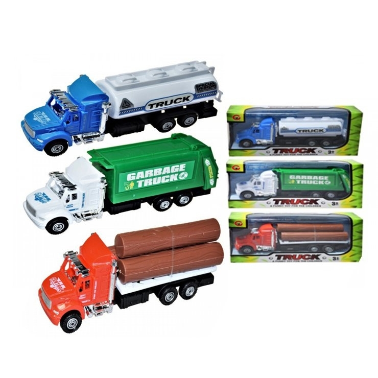 Minitruck technické stroje. Možnost výběru ze tří druhů - auto se dřevem, cisterna nebo kontejner. Rozměry stroje jsou 16,5 x 6cm. Cena je za 1 kus. Nevhodné pro děti do 3 let. číst celé