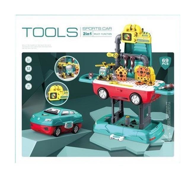 Zabawka warsztat dla dzieci posiada nowoczesny wygląd w kształcie samochodu. Teraz zabawa z tym warsztatem stanie się przyjemna. W zestawie znajduje się m.in.: śrubokręt, śruby, klucz, młotek. W zestawie znajduje się 69 części. Po rozłożeniu zabawka ma wymiary 53x26x51cm. Warsztat można łatwo złożyć do jego pierwotnej postaci.#&Produkt dla dzieci od 3 lat. #&Podane wymiary są wymiarami opakowania.#&Zabawka zapakowana w kartonowe opakowanie z okienkiem.