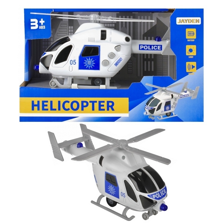 Má zvukové a světelné efekty - zvuk motoru, výstražné signály, po nastartování se výstražná světla rozsvítí modře, má pohyblivou vrtuli. Hra s policejním vrtulníkem může trvat věčně. Balení obsahuje vrtulník. Rozměry balení jsou 23x14x10cm. Vyžaduje 2 x AG13 baterie - součástí balení. Hračka je určena pro děti ve věku 3+.