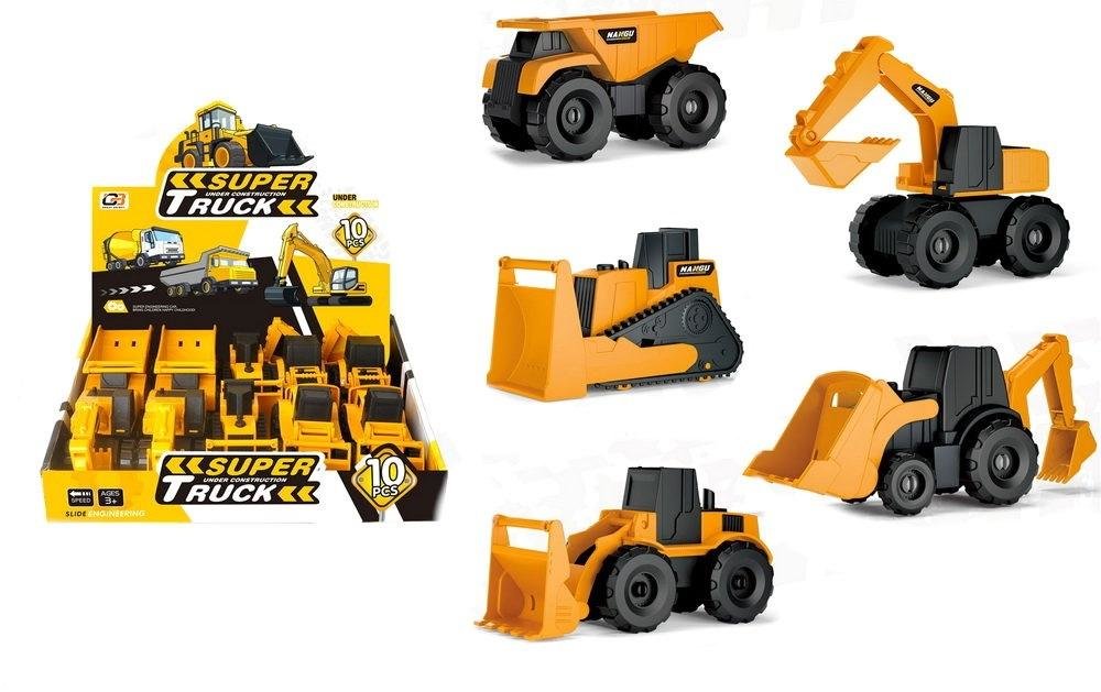 Zbierz całą kolekcję pojazdów budowlanych! Idealne samochodziki bez napędu do rączki dla dzieci od 3 lat. Do wyboru mamy koparkę, wywrotkę, spychacz, koparkę z ładowarkę oraz ładowarkę. Każde nich ma ruchome elementy, które posiadają blokadę opadania, dzięki temu dziecko podczas zabawy może w pełni wykorzystać je do mini prac budowlanych.