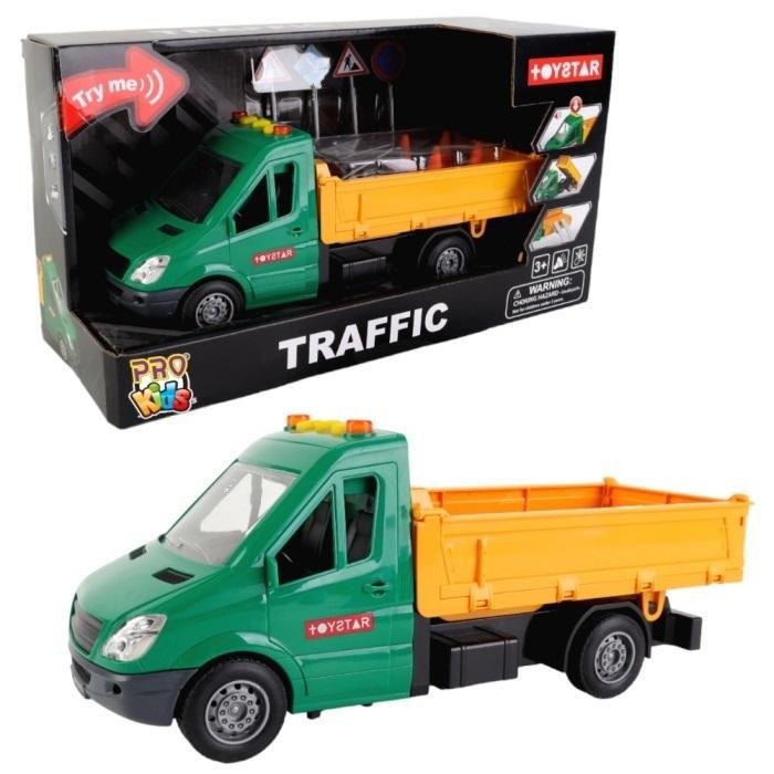 Pojazd z przyczepą typu wywrotka: to realistycznie wykonany pojazd służby pomocy drogowej z przyczepą, która posiada funkcję wywrotki. Dzieci mogą łatwo przenosić i transportować różne przedmioty, udając, że pomagają w usuwaniu przeszkód z dróg.