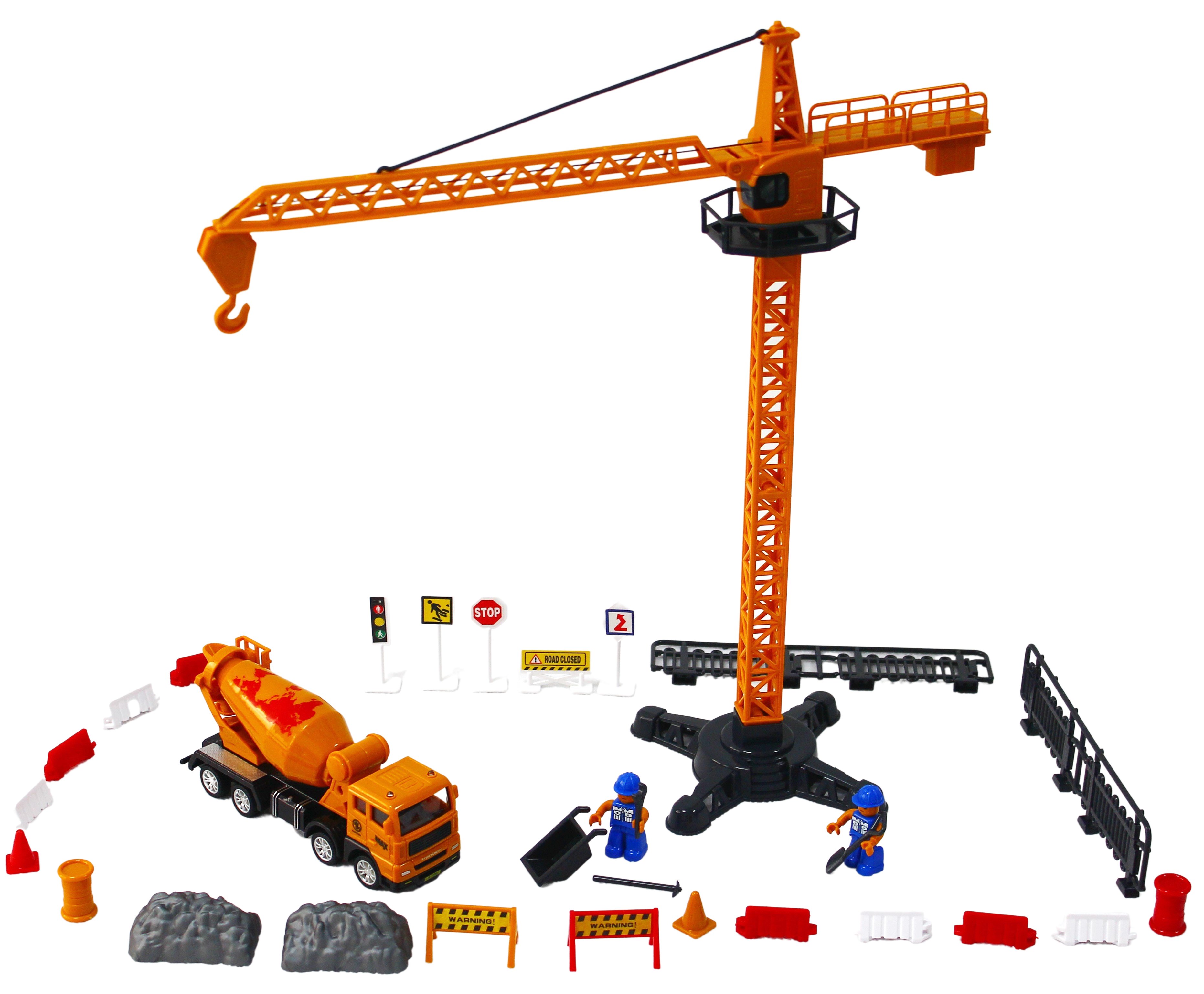 - Obsahuje stavební auto míchačku, vysoký jeřáb, dvě figurky, dopravní značky, zábrany, nářadí a další doplňky.