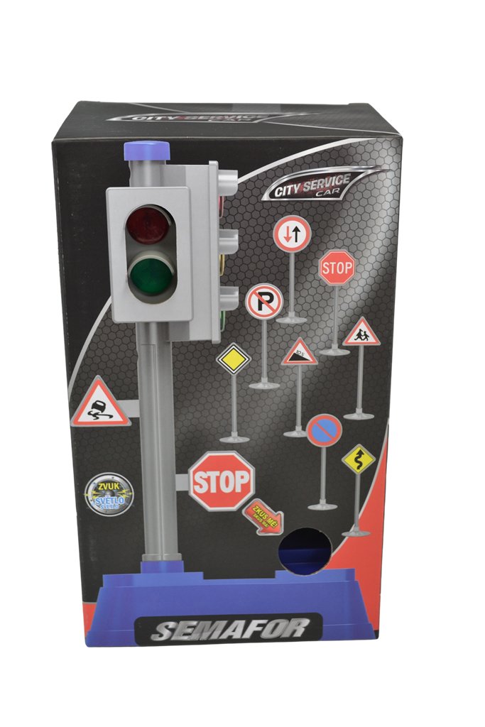 Sada zahrnuje kromě samotného semaforu také 8 dopravních značek a tři značky bez sloupků, které lze snadno připevnit na sloupek semaforu, čímž umožníte vytvořit ucelenou dopravní scénu pro nácvik pravidel bezpečného chování na silnici. Semafor je vyroben z kvalitního plastu, má výšku 23 cm, značky pak cca 9 cm, což zajišťuje skvělou viditelnost a manipulaci pro malé děti.