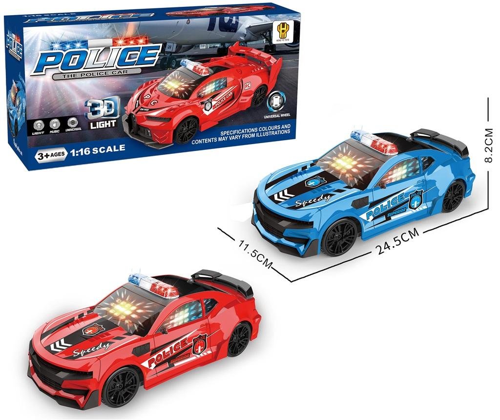 Auto policyjne na baterie. Jeździ, odbija się od przeszkód, wydaje dźwięki i świeci. číst celé