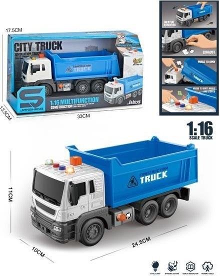 Ciężarówka wywrotka może zostać wykorzystana podczas zabawy w plac budowy. Auto posiada funkcję podnoszenia i co sprawia, że wywrotka się unosi. Zabawka świeci kolorowymi światełkami naprzemiennie i wydaje dźwięki: klaksonu, cofania, odpalania silnika, syreny alarnowej. Zabawka działa na baterie typu AG13. Baterie znajdują się w zabawce. Produkt zapakowany w kartonowe opakowanie z okienkiem. Zabawka przeznaczona dla dzieci od 3 lat. Podane wymiary są wymiarami opakowania.