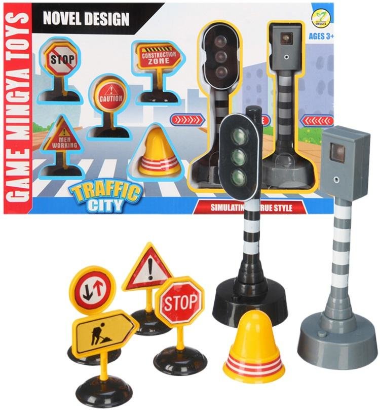 Zestaw znaków drogowych razem z fotoradarem oraz sygnalizatorem świetlnym zasilanymi bateriami. číst celé