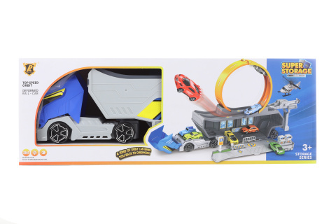 Sada obsahuje velký kamion, dráhu a 2 autíčka. Po rozložení kamion funguje ve spodní části jako základna, v horní jako prostor pro dráhu. Autíčko se vystřeluje pomocí gumiček umístěných v zadní části kamionu. Materiál plast. Baleno v krabici. Rozměry balení cca 47x17x10 cm. Věk 3+ číst celé
