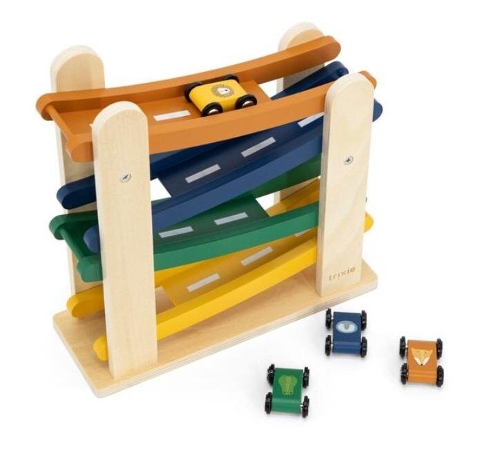 Wspaniały Tor Wyścigowy Drewniany, który gwarantuje wiele godzin radosnej zabawy! Zestaw zawiera wielopoziomowy tor wyścigowy i 4 samochody, każdy w innym kolorze z emblematem wesołych zwierzaków. Wystarczy ustawić samochód na górze i obserwować, jak zjeżdża w dół, przeskakując na kolejne tory. Zabawa torem wyścigowym pobudza naturalną ciekawość i rozwija wyobraźnie najmłodszych. Tor Wyścigowy marki Trixie Baby wykonany jest z najwyższej jakości drewna bukowego i sklejki, co przekłada się na bezpieczeństwo dzieci i przyjazność dla środowiska. Wiek: 18 m+