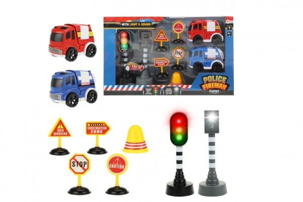 Auto 2ks policie,hasiči+semafor,radar,značky plast na bat. se zvukem se světlem v krab. 38x22,5x7cm