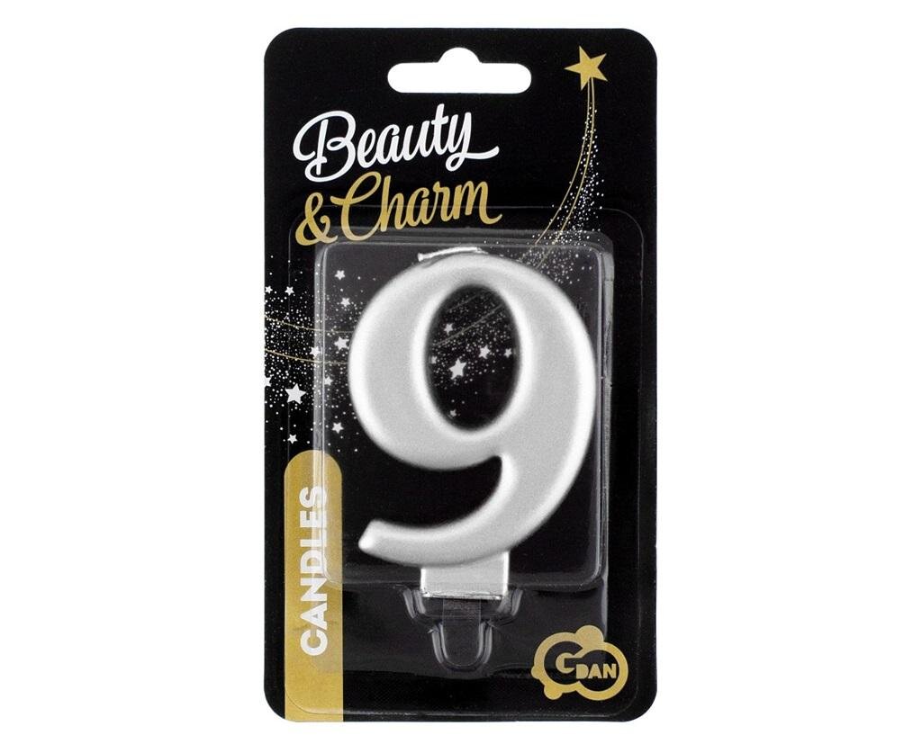 Cyferka dziewiątka w kolorze srebrnym metalicznym