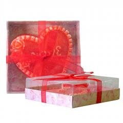 Świeczka w kształcie serca z napisem "Love", zapakowana jako upominek w pudełeczko przewiązane wstążeczką. Wymiar świeczki 9x9cm. číst celé