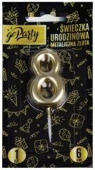 Świeczka cyferka "8" - ozdoba na tort urodzinowyCechy produktu:cyfra: 8kolor: złoty metalicznywysokość: 6 cmpatyczek ułatwiający wbicie w tortbezpieczny wosk, bez zapachuIdealna na:tort urodzinowyprzyjęciesesję zdjęciową z tortem (cake smash)dekorację stołu urodzinowego
