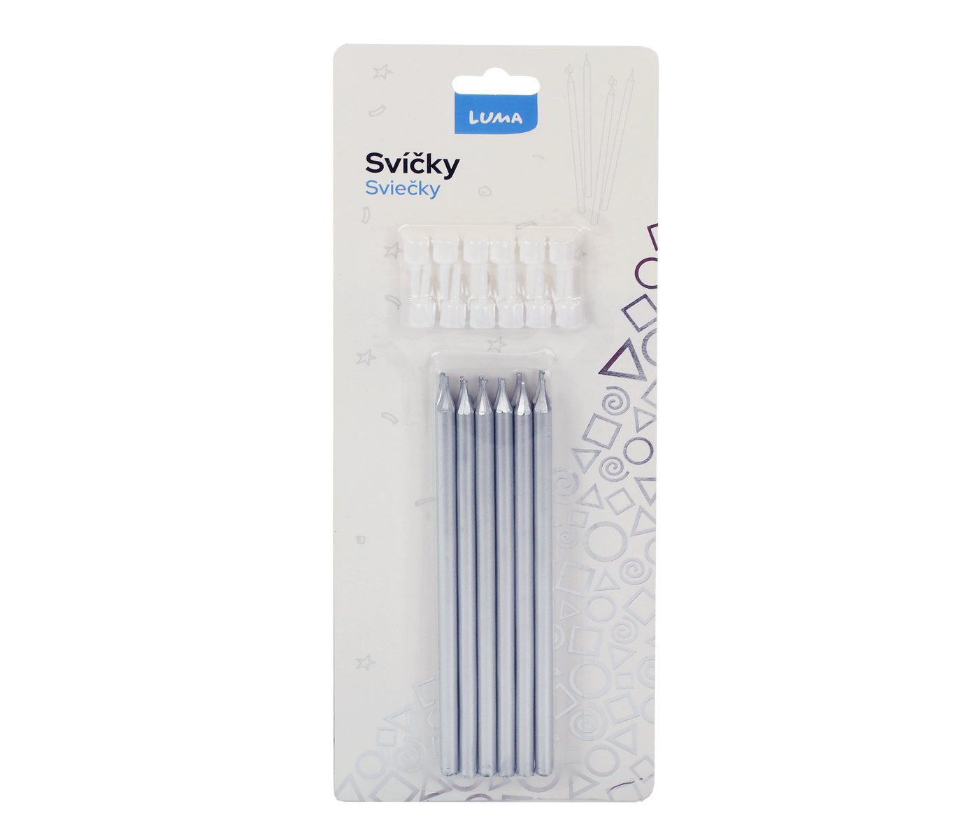 Tato sada obsahuje 12 svíček v moderní stříbrné barvě, která se snadno sladí s jakýmkoliv barevným motivem oslavy. Díky přiloženým stojánkům je jejich zapíchnutí do dortu nebo jiné dekorace rychlé a bezpečné. Svíčky mají průměr 5,5 mm a výšku 125 mm, což je ideální velikost pro slavnostní používání a dlouhotrvající hoření.