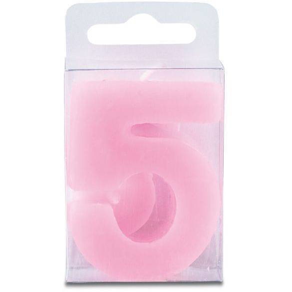 Svíčka ve tvaru číslice 5, růžová barva, výška 4 cm. Je vhodná především pro zdobení narozeninového dortu a podobných moučníků.