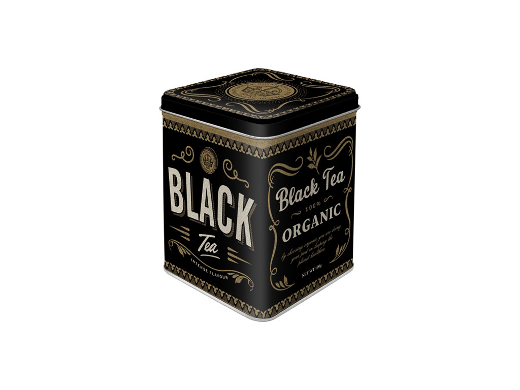 Retro plechová dóza na čaj s textem je originální dekorace.